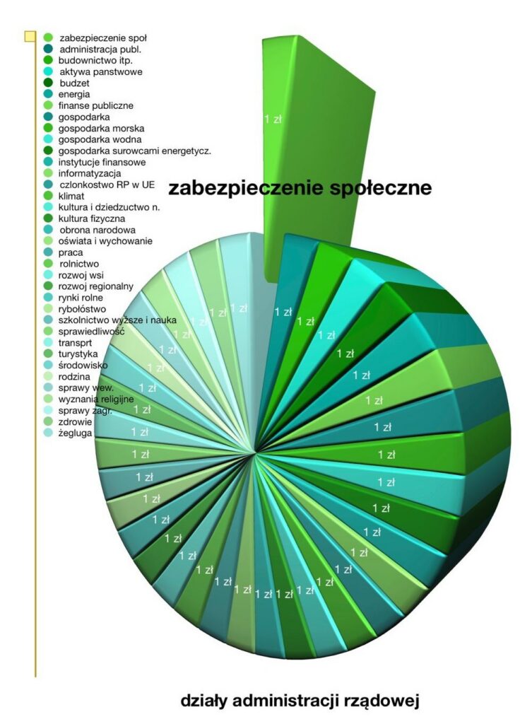 Poniżej zamieszczam grafikę przedstawiającą 36 działów administracji rządowej w postaci kolorowego tortu, z którego jedna część pt. zabezpieczenie społeczne jest wysunięta.